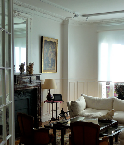 Ce sont les œuvres, éclairées par des spots orientables sur rail au plafond, qui renvoient la lumière dans la pièce ; c'est bien l'art qui nous illumine !